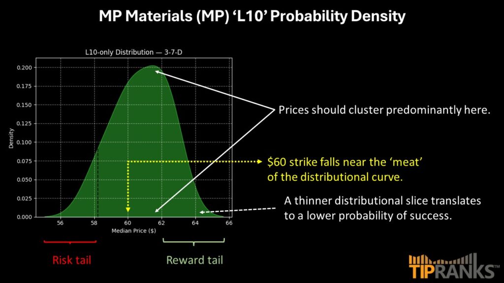 데이터를 적용한다면 2026년 1월 16일 만기 55/60 불 콜 스프레드가 가장 매력적으로 보인다. 이 거래는 만기 시 최대 수익률 100%를 달성하기 위해 MP 주식이 두 번째 레그 행사가격(60)을 돌파해야 하며, 이는 확률 밀도와 무게중심을 고려할 때 현실적인 목표다.