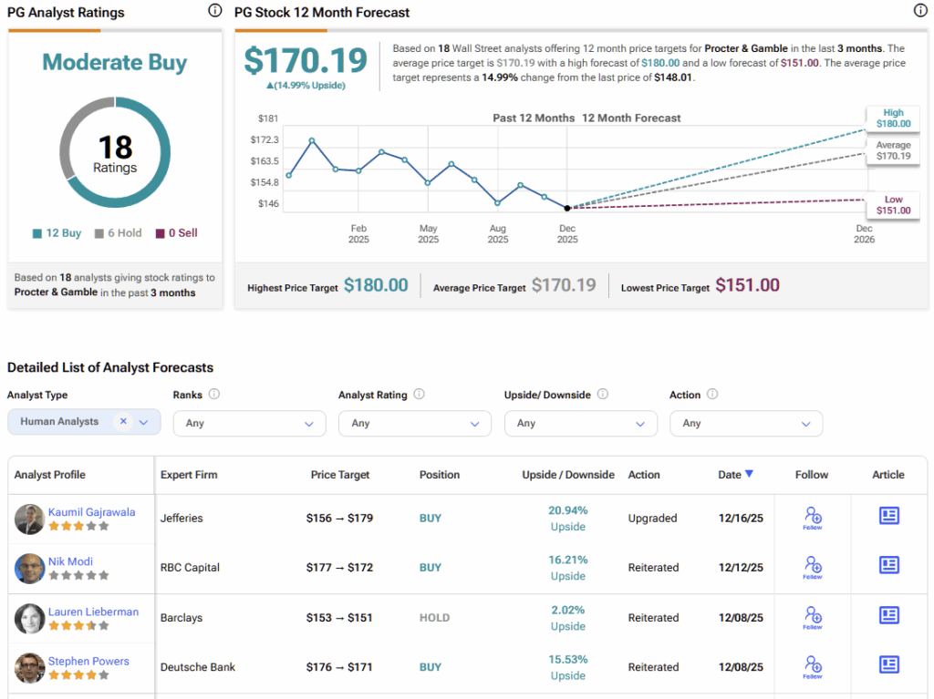 월가에서 PG 주식은 지난 3개월 동안 11건의 매수와 7건의 보유 의견을 바탕으로 적극 매수 컨센서스 등급을 받고 있다. 어떤 증권가도 주식을 매도로 평가하지 않는다. PG의 평균 목표주가 168.75달러는 향후 12개월 동안 약 16%의 상승 여력을 시사한다.