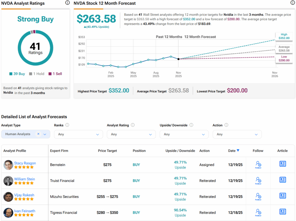 증권가에서 애널리스트들은 지난 3개월간 39건의 매수, 1건의 보유, 1건의 매도 의견을 제시하며 NVDA 주식에 대해 강력 매수 컨센서스 등급을 부여했다. 또한 NVDA의 평균 목표주가는 주당 263.58달러로 43.5%의 상승 여력을 시사한다.