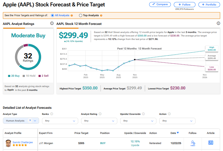애플 주식은 월가 애널리스트 32명 사이에서 보통 매수 등급의 컨센서스를 받고 있다. 이 등급은 지난 3개월 동안 발표된 매수 20건, 보유 10건, 매도 2건의 의견을 기반으로 한다. AAPL 평균 목표주가는 299.49달러로 현재 수준에서 10.12%의 상승 여력을 시사한다.