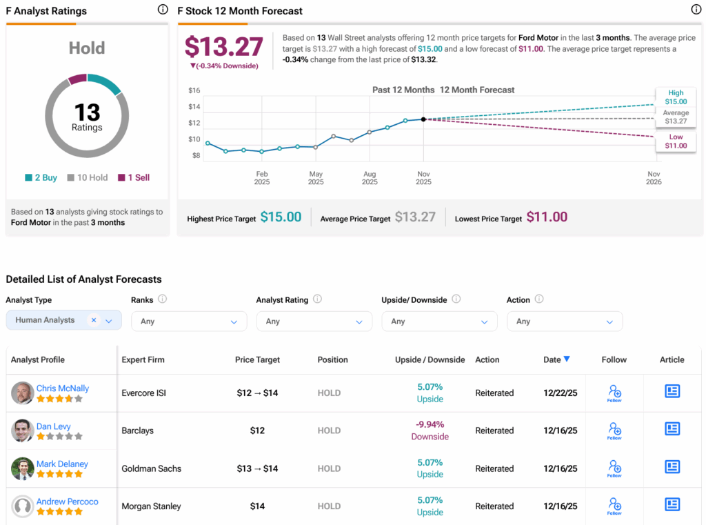월가에서 애널리스트들은 지난 3개월간 매수 2건, 보유 10건, 매도 1건을 부여하여 F 주식에 대해 보유 컨센서스 등급을 제시하고 있다. 지난 1년간 주가가 34.33% 상승한 후, 평균 F 목표주가는 주당 13.27달러로 0.34%의 하락 여력을 시사한다.