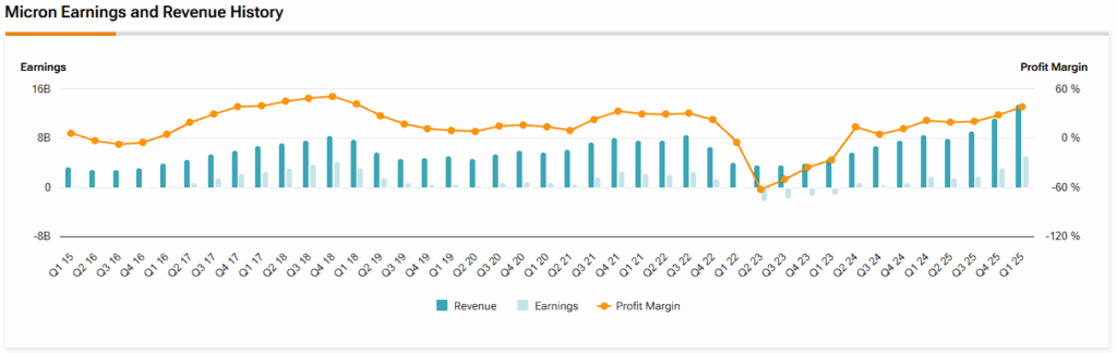 마이크론의 최근 실적 발표는 대성공이었다. 약 136억 달러의 매출과 주당순이익 4.78달러를 기록하며 모두 컨센서스를 편안하게 상회했다. 매출총이익률은 50%대 중반으로 확대됐고, 잉여현금흐름은 39억 달러로 회사 기록을 경신했다. 이러한 성장과 마진 확대의 조합은 보통 사이클 후반에 나타난다. 시장은 사이클 초기로 보이는 시점에서 이 결과가 얼마나 인상적인지 인식했으며, 마이크론 주가는 이미 강력한 연초 대비 상승세를 이어갔다.