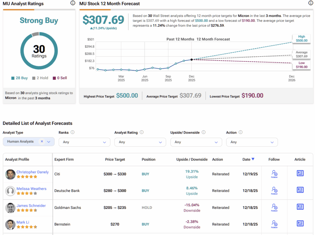 월가에서 마이크론 주식은 지난 3개월간 매수 28개, 보유 2개 의견을 바탕으로 적극 매수 컨센서스 등급을 받고 있다. 어떤 애널리스트도 이 주식을 매도로 평가하지 않는다. 또한 마이크론의 평균 목표주가 307.69달러는 향후 12개월간 약 11%의 상승 여력을 시사한다.
