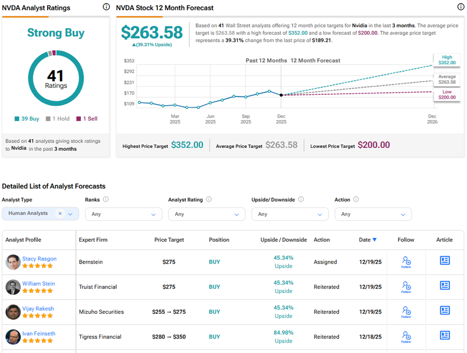 월가는 엔비디아의 장기 전망에 대해 매우 낙관적이다. 팁랭크스에서 NVDA는 39개의 매수, 1개의 보유, 1개의 매도 의견을 바탕으로 강력 매수 컨센서스 등급을 받고 있다. 엔비디아의 평균 목표주가 263.58달러는 현재 수준 대비 39.3%의 상승 여력을 시사한다. 연초 대비 NVDA 주가는 약 41% 상승했다.
