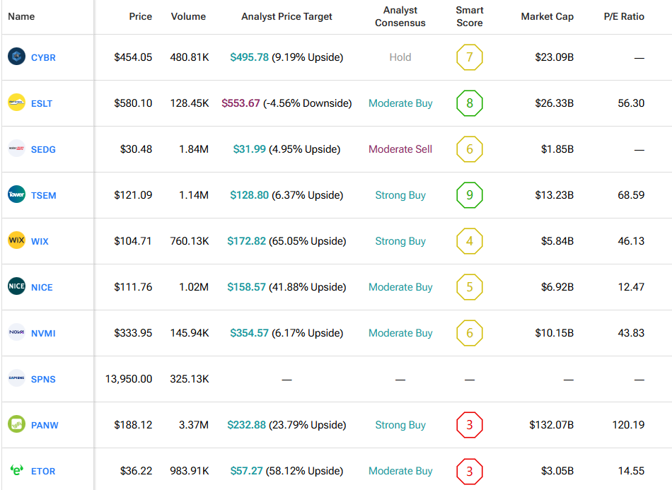 우리는 팁랭크스 비교 도구를 사용하여 월가에 상장된 주목할 만한 이스라엘 기업들을 정리했다. 이는 각 기업과 이스라엘 분야 전반에 대한 심층적인 시각을 얻을 수 있는 훌륭한 도구다.