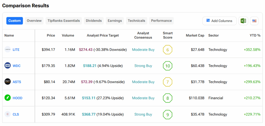 팁랭크스의 주식 비교 도구를 사용하여 월가 증권가가 LITE, WDC, ASTS, HOOD, CLS를 어떻게 평가하고 있으며, 어떤 주식이 가장 강력한 상승 여력을 가지고 있다고 보는지 살펴보자.