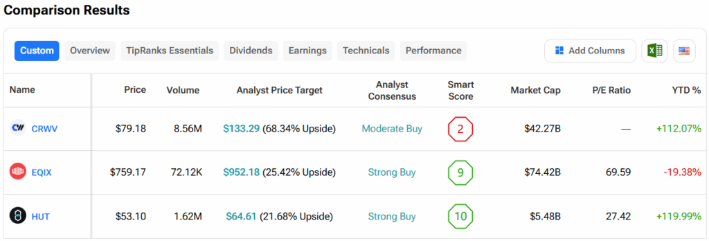 월가로 눈을 돌리면, 위에서 언급한 세 데이터센터 주식 중 증권가는 CRWV 주식이 가장 큰 상승 여력을 가지고 있다고 본다. 실제로 코어위브의 평균 목표주가는 주당 133.29달러로 68% 이상의 상승 잠재력을 시사한다.