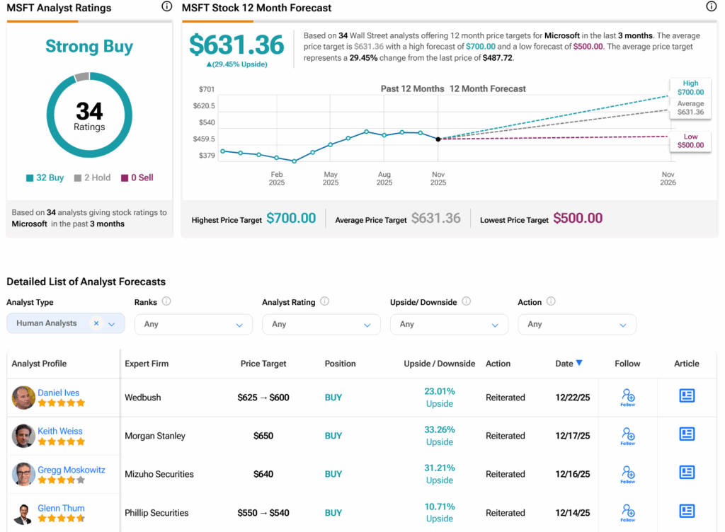월가에서 애널리스트들은 지난 3개월간 32건의 매수와 2건의 보유 의견을 제시하며 MSFT 주식에 대해 강력 매수 컨센서스 등급을 부여했다. 지난 1년간 주가가 11.13% 상승한 후, 평균 MSFT 목표주가는 주당 631.36달러로 29.45%의 상승 여력을 시사한다.