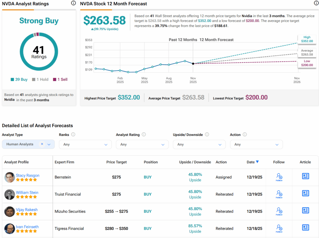 월가 증권가는 지난 3개월간 매수 39건, 보유 1건, 매도 1건의 의견을 제시하며 NVDA 주식에 대해 강력 매수 컨센서스 등급을 부여했다. 또한 NVDA의 평균 목표주가는 주당 263.58달러로 39.8%의 상승 여력을 시사한다.