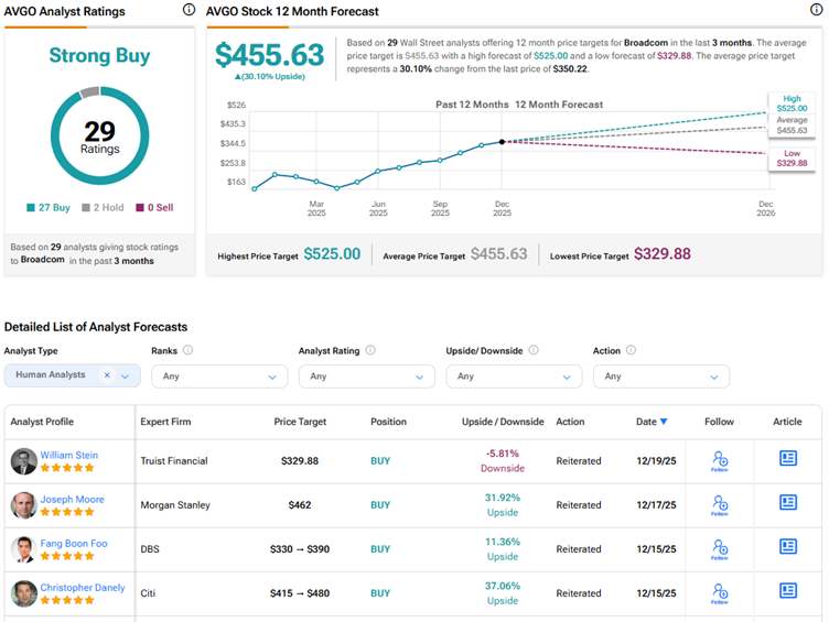 27개의 매수와 2개의 보유 의견으로 브로드컴 주식은 강력 매수 컨센서스 등급을 받고 있다. 평균 AVGO 주가 목표가는 455.63달러로 30.1%의 상승 여력을 시사한다.