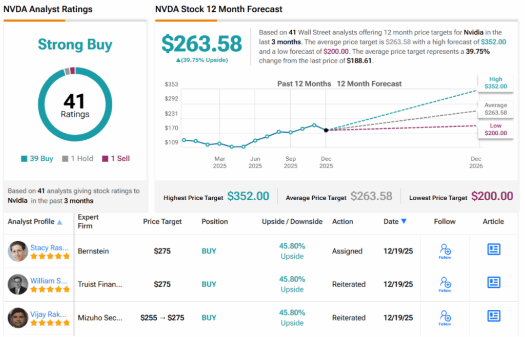 이것이 월가의 견해이기도 하다. 39개의 매수와 단 1개의 보유 및 매도 의견으로, NVDA는 적극 매수 컨센서스 등급을 누리고 있다. 12개월 평균 목표주가 263.59달러는 40%에 가까운 상승을 의미한다. (NVDA 주가 전망 참조)