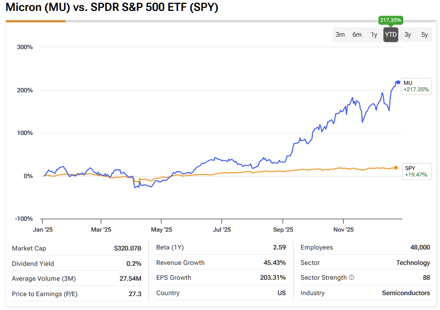 마이크론 테크놀로지(MU)는 올해 시장에서 가장 극적인 주가 상승을 기록한 기업 중 하나다. 주가는 연초 대비 217% 이상 급등하며 S&P 500(SPX)을 크게 앞질렀고, 현재 사상 최고가에 거래되고 있다. 이러한 놀라운 상승세에도 불구하고, 마이크론은 여전히 의미 있는 상승 여력을 갖고 있다고 판단된다.
