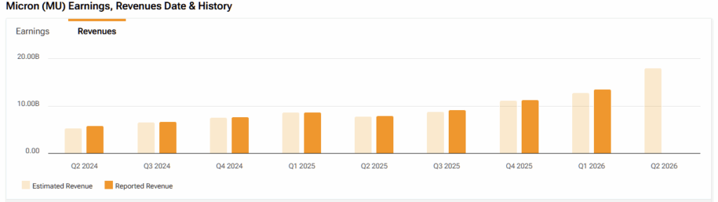 마이크론의 전망 가이던스는 낙관적 전망을 강화한다. 2026 회계연도 2분기에 회사는 중간값 기준 187억 달러의 매출을 예상하는데, 이는 2025년 2분기에 창출한 80억 달러의 2배 이상이다. 이는 전년 동기 대비 약 132%의 성장을 의미하며, 강력한 1분기 이후에도 놀라운 가속을 보여준다.