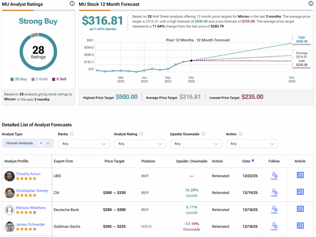 월가는 확고하게 낙관적이다. 컨센서스 등급은 적극 매수이며, 26개 매수, 2개 보유, 0개 매도 의견이다. 평균 목표주가는 316.81달러로, 현재 주가 대비 10% 이상의 상승 여력을 나타낸다.