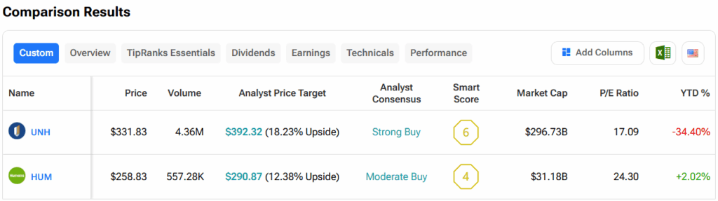 월가로 눈을 돌리면, 위에서 언급한 두 주식 중 증권가는 UNH 주식이 HUM보다 더 큰 상승 여력이 있다고 본다. 실제로 UNH의 주당 목표주가 392.32달러는 18.2%의 상승 여력을 시사하는 반면, HUM은 12.4%다.