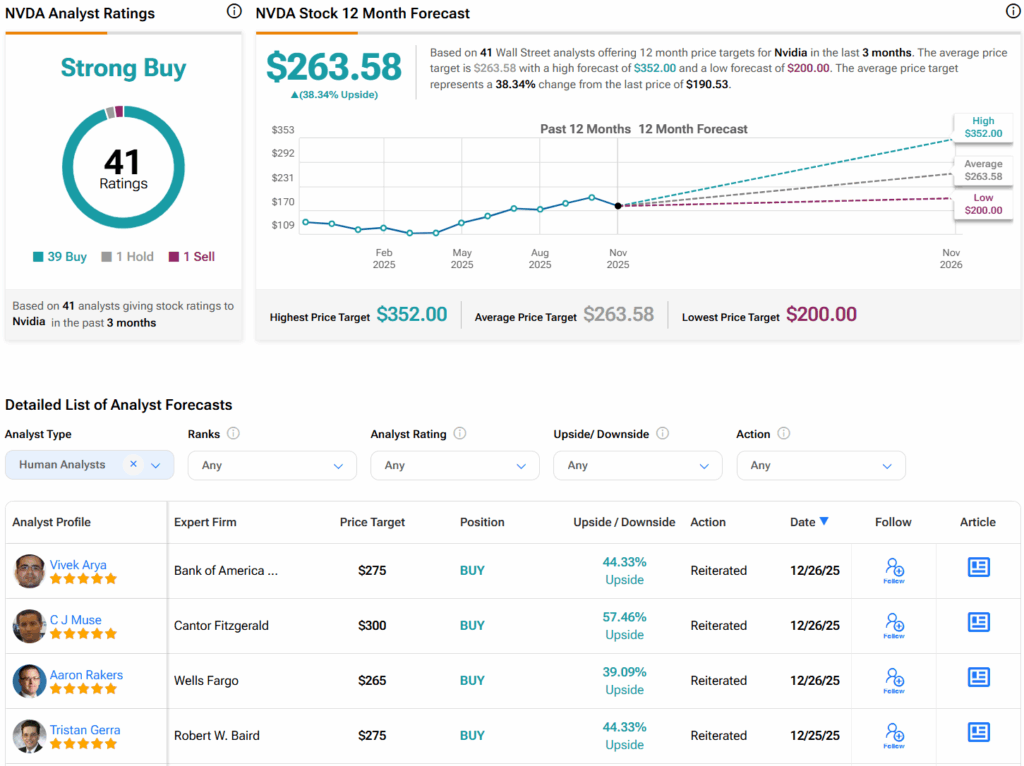 월가에서 애널리스트들은 지난 3개월간 39건의 매수, 1건의 보유, 1건의 매도 의견을 제시하며 엔비디아 주식에 대해 아래 그래프에 표시된 것처럼 강력 매수 컨센서스 등급을 부여했다. 또한 주당 평균 엔비디아 목표주가 263.58달러는 38.3%의 상승 여력을 시사한다.