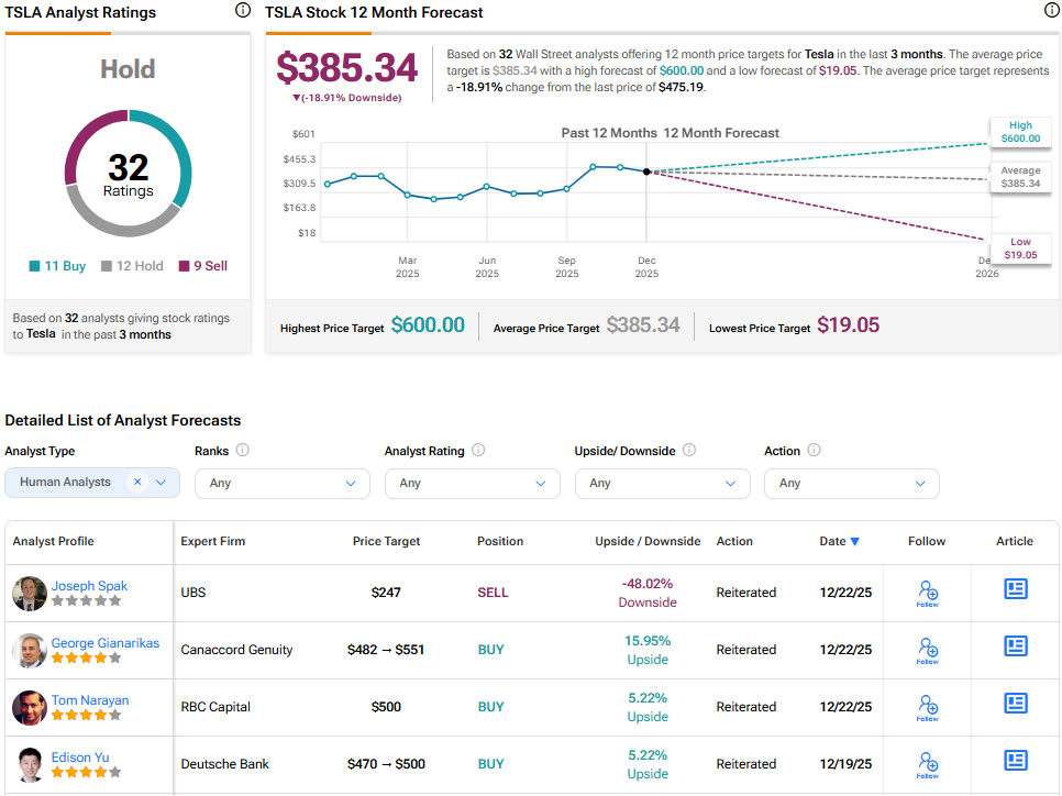 증권가에서 테슬라는 보유 의견으로 애널리스트들의 견해가 엇갈린다. 테슬라 주식 평균 목표가는 385.34달러로 현재 가격 대비 18.91% 하락 여력을 시사한다.