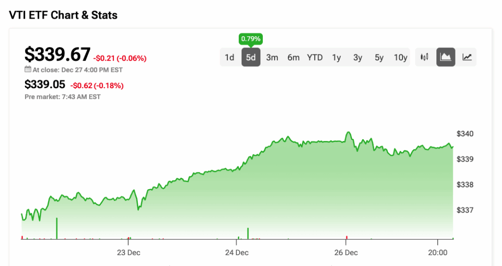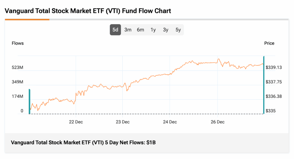 VTI의 3개월 평균 거래량은 414만 주로 강력한 유동성을 보여준다. 지난 5일간 이 ETF는 약 10억 달러의 순유입을 기록하며 투자자들의 강력한 수요와 미국 주식시장 전반에 대한 신뢰 증가를 나타냈다.