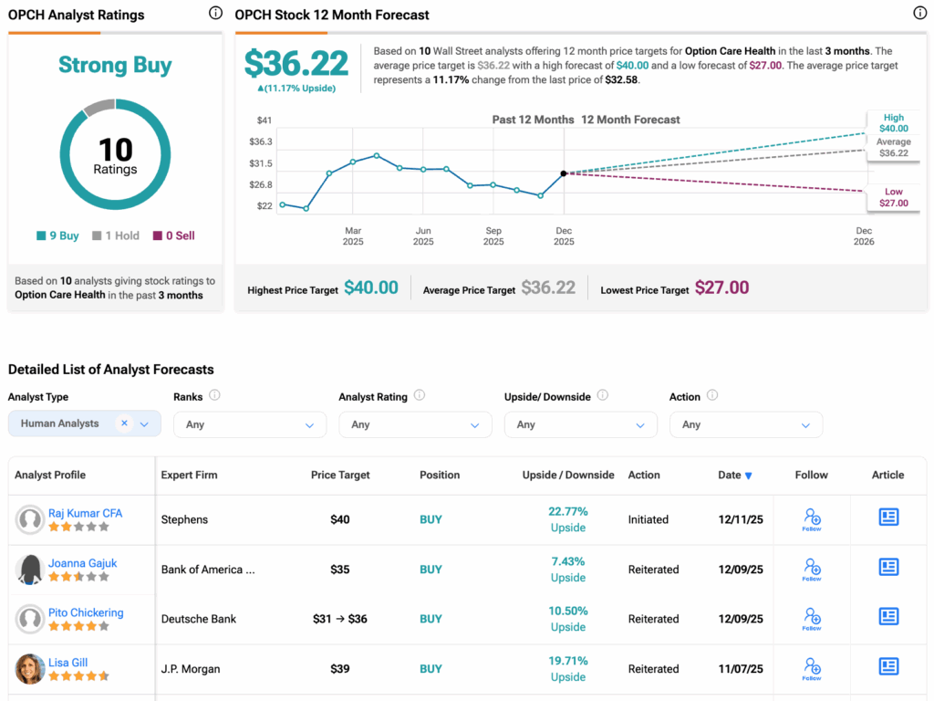 그럼에도 월가 증권가는 추가 상승 가능성에 대해 여전히 낙관적이며, OPCH 주식을 커버하는 10명의 애널리스트 중 9명이 매수 의견을 제시했다. 팁랭크스에 따르면 이 종목의 목표주가는 36.22달러로, 현재 수준 대비 11%의 상승 여력을 내포하고 있다.