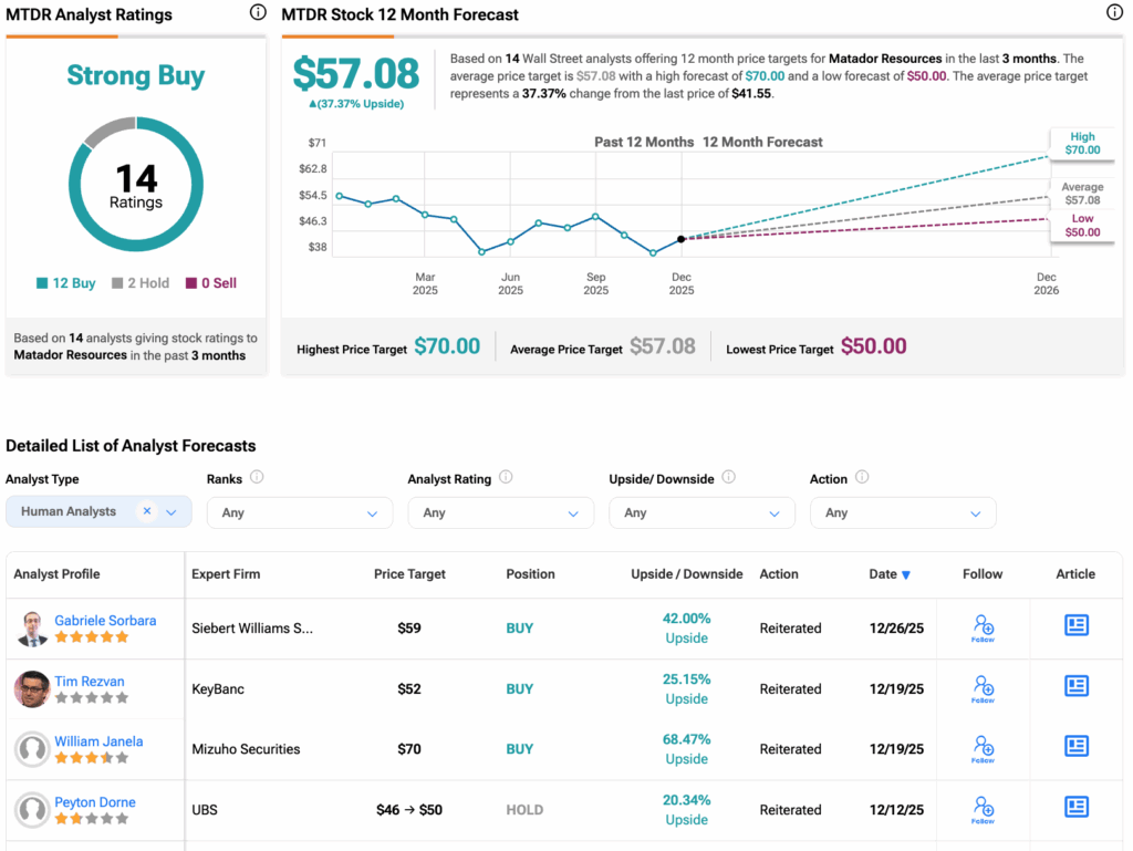 MTDR 주식은 적극 매수 의견을 받고 있으며, 최근 3개월간 12건의 매수 의견이 제시됐다. 마타도르 리소시스의 평균 목표주가는 57.08달러로, 37.37%의 상승 가능성을 시사한다.