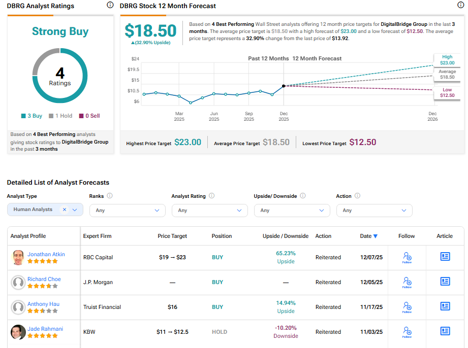 월가로 눈을 돌리면, 지난 3개월간 매수 3건과 보유 1건을 기록한 디지털브리지에 대한 증권가의 컨센서스 등급은 적극 매수다. 이와 함께 DBRG 주가 목표치는 18.50달러로, 주가의 잠재적 상승 여력은 32.90%다.