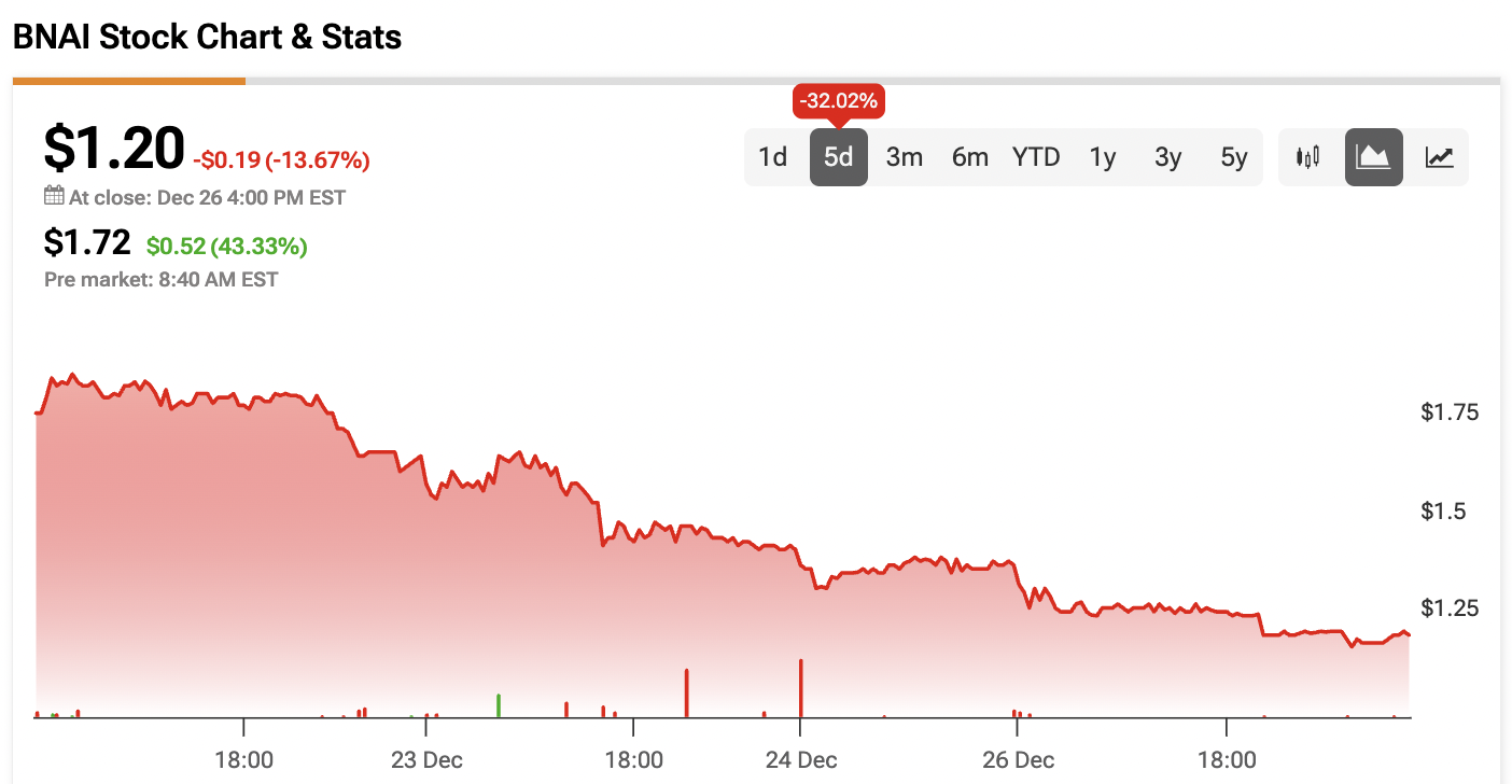 브랜드 인게이지먼트 네트워크 (BNAI) 주식이 오늘 급등세를 보이고 있으며, 장전 거래에서 0.52달러(약 43.33%) 이상 급등하여 1.72달러에 도달했다. 이러한 대규모 상승은 회사가 글로벌 10대 제약 고객을 위한 맞춤형 AI 인게이지먼트 도구를 구축하기 위해 선도적인 글로벌 광고 대행사와 벤더 서비스 프로젝트 계약을 체결했다고 발표한 이후 나타났다. 특정 고객의 신원은 기밀로 유지되지만, 시장은 즉각적인 재무 영향에 강하게 반응하고 있다. 이번 분기에 25만 달러의 개발 수익이 예상된다.