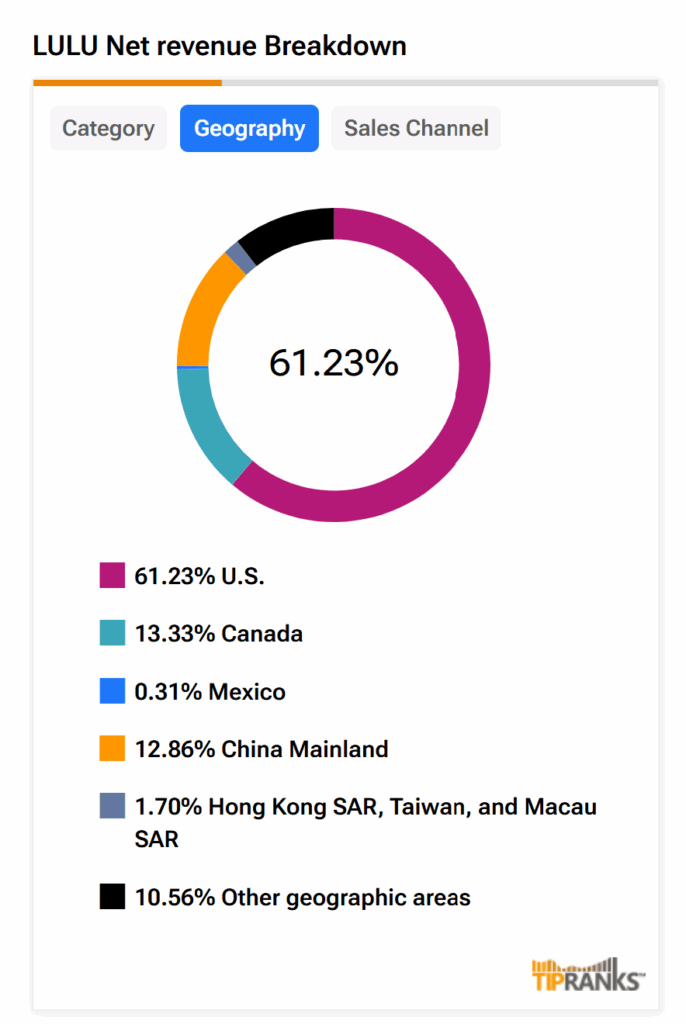 최근 2025년 3분기 실적에서 룰루레몬은 국제 매출이 33% 증가했음에도 불구하고 미국 매출이 2% 감소했으며, 미국은 3% 하락, 캐나다는 보합세를 보였다. 매출총이익률도 관세 영향과 마크다운 증가, 즉 판매 부진 제품을 정리하기 위한 재고의 영구적 가격 인하로 인해 290bp 하락했다.