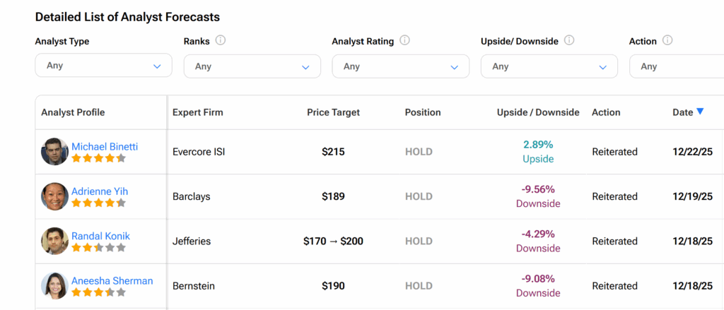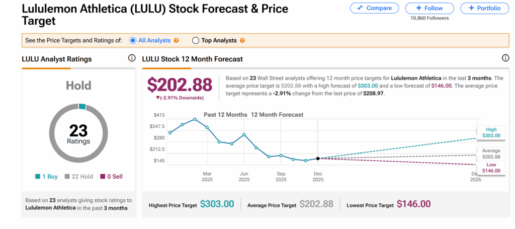 또한 LULU 평균 목표주가 202.88달러는 현재 거래 수준에서 약 3%의 하락 여력을 시사한다.