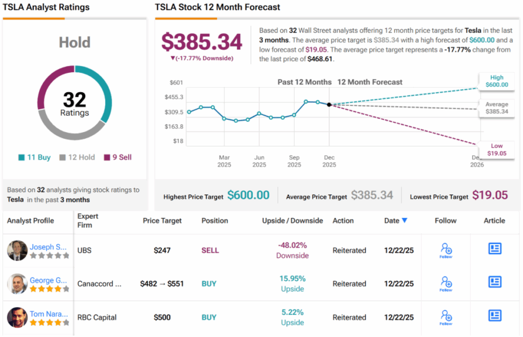 테슬라는 월가에서 다양한 의견을 불러일으킨다. 매수 11개, 보유 12개, 매도 9개로 TSLA는 컨센서스 보유(즉, 중립) 등급을 받고 있다. 12개월 평균 목표주가 385.34달러는 18% 미만의 하락 여력을 시사한다. (TSLA 주식 전망 참조)