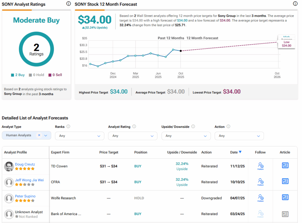 월가로 눈을 돌리면, 증권가의 소니에 대한 컨센서스 등급은 적극 매수다. 지난 3개월 동안 2건의 매수 등급을 기록했다. 이와 함께 평균 SONY 주가 목표는 34달러로, 주식의 잠재적 상승 여력은 32.24%다.