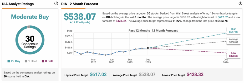 월가는 DIA 주식이 상승할 여지가 있다고 보고 있다. 지난 3개월 동안 증권가는 평균 DIA 목표주가를 538.07달러로 제시했으며, 이는 현재 가격 대비 11.22%의 상승 여력을 의미한다. DIA의 30개 보유 종목은 매수 의견 29개, 보유 의견 1개, 매도 의견 0개를 받았다.
