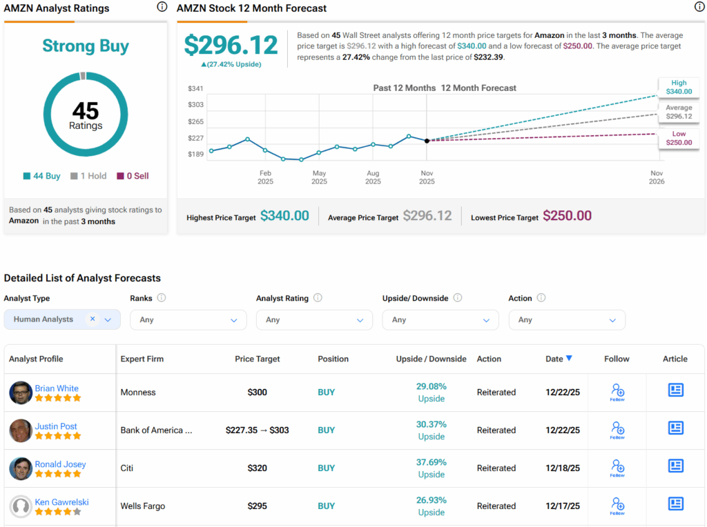 월가를 살펴보면, 애널리스트들은 지난 3개월간 44건의 매수와 1건의 보유 의견을 제시하며 AMZN 주식에 대해 강력 매수 컨센서스 등급을 부여했다. 또한 주당 평균 AMZN 목표주가 296.12달러는 27.4%의 상승 여력을 시사한다.