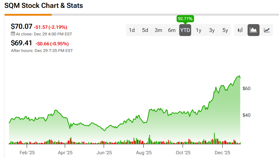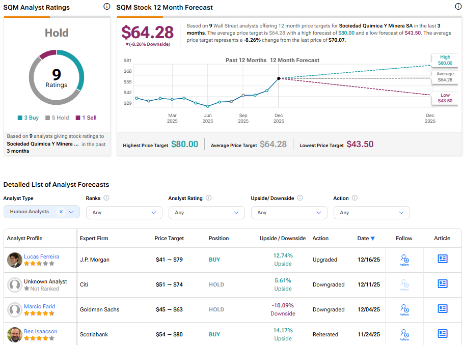 증권가에서 SQM은 보유 의견으로 의견이 엇갈리고 있다. SQM 평균 목표주가는 64.38달러로, 현재 주가 대비 8.26% 하락 여력을 시사한다.