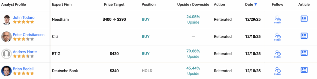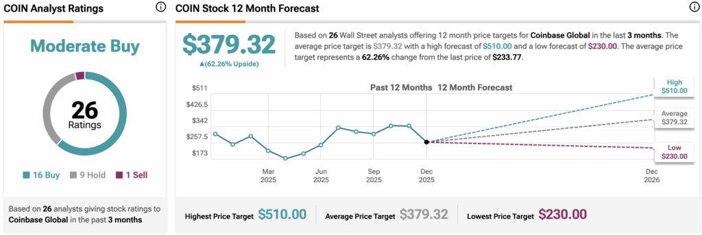 애널리스트들은 평균 12개월 COIN 목표주가를 379.32달러로 제시했으며, 이는 최근 주가 대비 52.3% 상승 여력을 나타낸다.