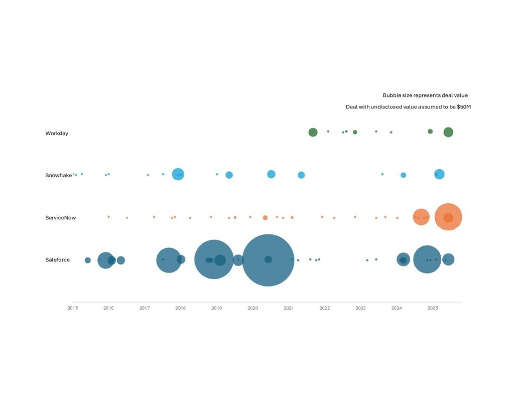 코호트에서 가장 엄격한 유기적 성장 추구자였던 워크데이조차 최근 자체 파워 오브 원 철학을 깨고 플로와이즈와 파이프드림을 인수했다. 이러한 거래들은 내부 에이전틱 AI 로드맵이 너무 느렸다는 것을 인정한 것이다.