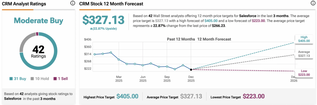 평균 12개월 세일즈포스 목표주가는 327.13달러다. 이 목표가는 최근 주가 대비 22.9%의 강력한 상승 여력을 시사한다.