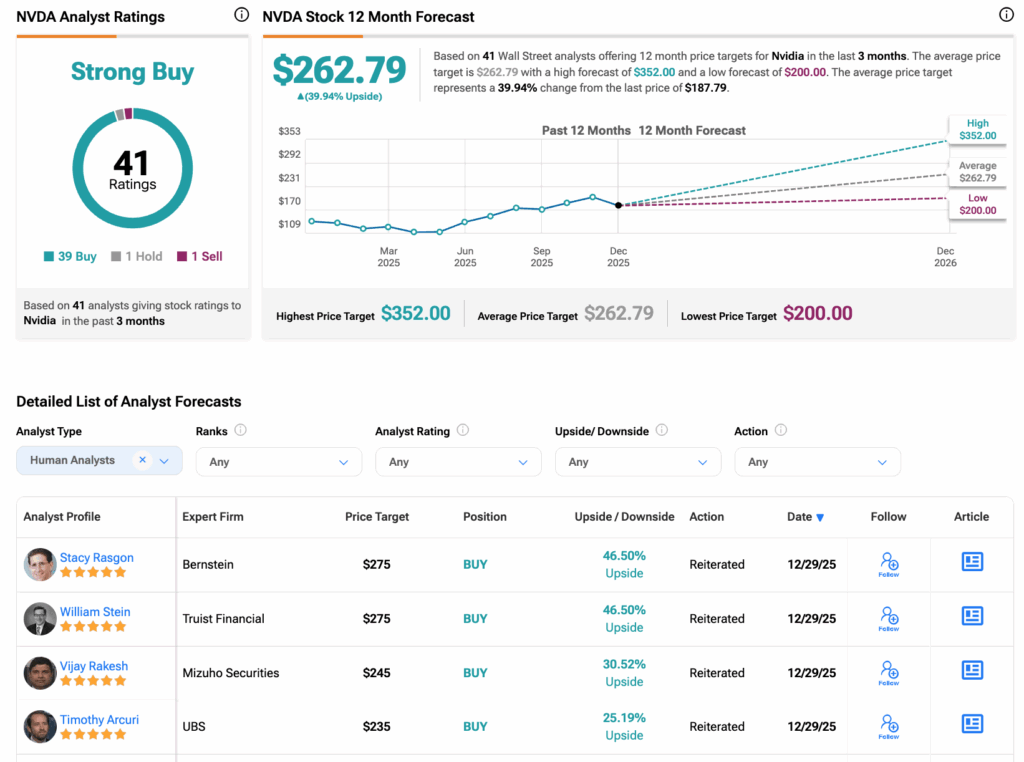 엔비디아(NVDA)는 2025년을 AI 붐의 확실한 선두주자로 마무리했지만, 월가는 랠리가 아직 끝나지 않았을 수 있다고 보고 있다. 폭발적인 데이터센터 수요와 기록적인 실적에 힘입어 대규모 상승세를 보인 후, 애널리스트들은 엔비디아가 여전히 의미 있는 상승 여력을 가지고 있다는 확신을 점점 더 키우고 있다. 월가 애널리스트들은 평균적으로 강력한 AI 수요와 고성능 컴퓨팅 분야에서의 엔비디아 리더십 확대에 힘입어 2026년에 주가가 40% 더 오를 것으로 전망하고 있다.