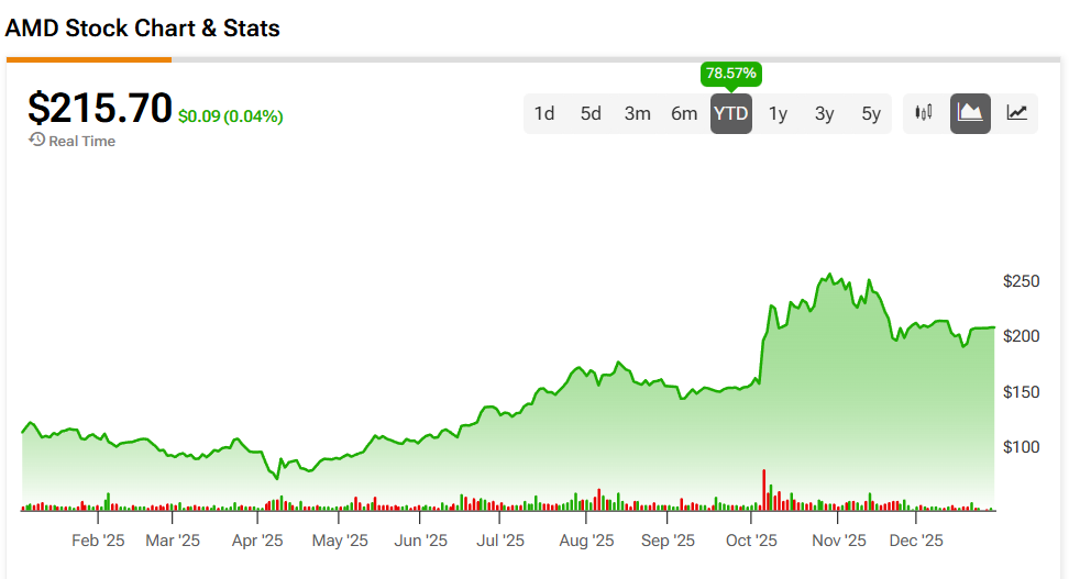 AMD 주식은 화요일 0.04% 상승하며 연초 대비 78.57% 상승세를 이어갔다. 주가는 지난 12개월 동안에도 78.5% 증가했다.