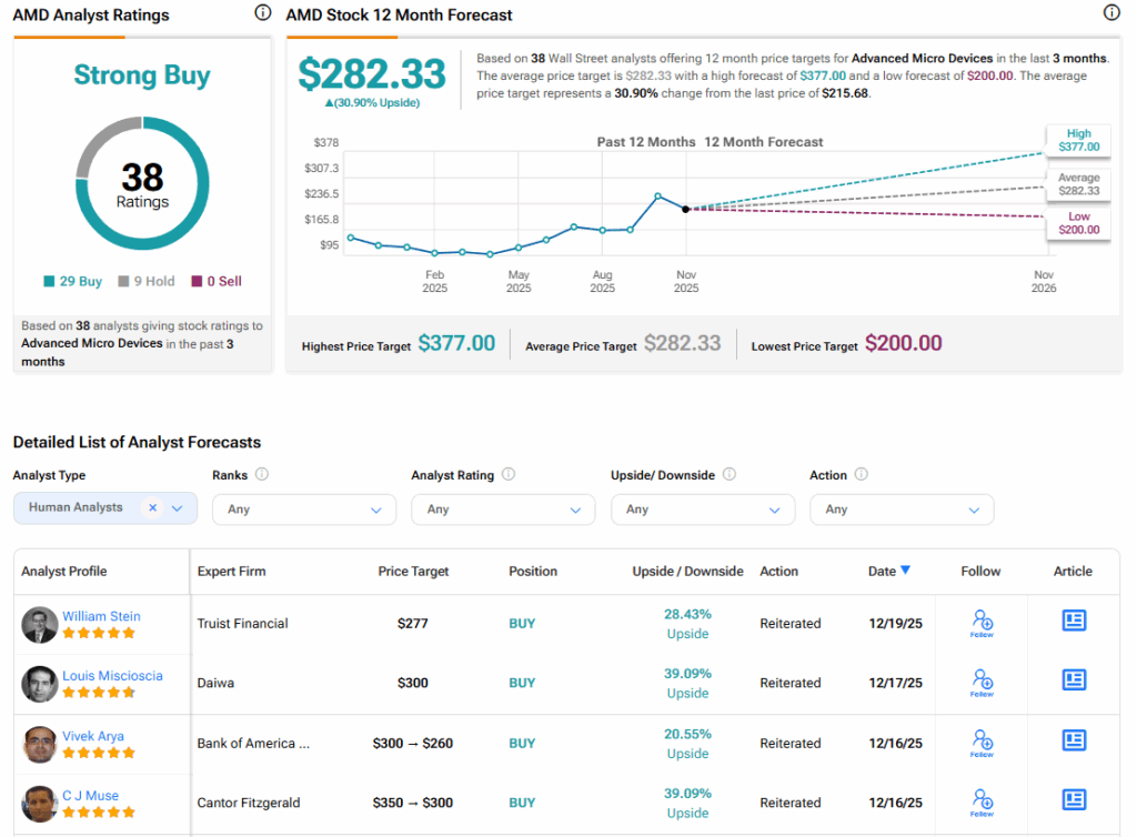 증권가에서는 지난 3개월간 매수 29건, 보유 9건의 의견을 바탕으로 AMD에 대한 컨센서스 등급을 '적극 매수'로 제시하고 있다. 이와 함께 AMD 주식의 평균 목표주가는 282.33달러로, 주가의 잠재적 상승 여력은 30.9%다.