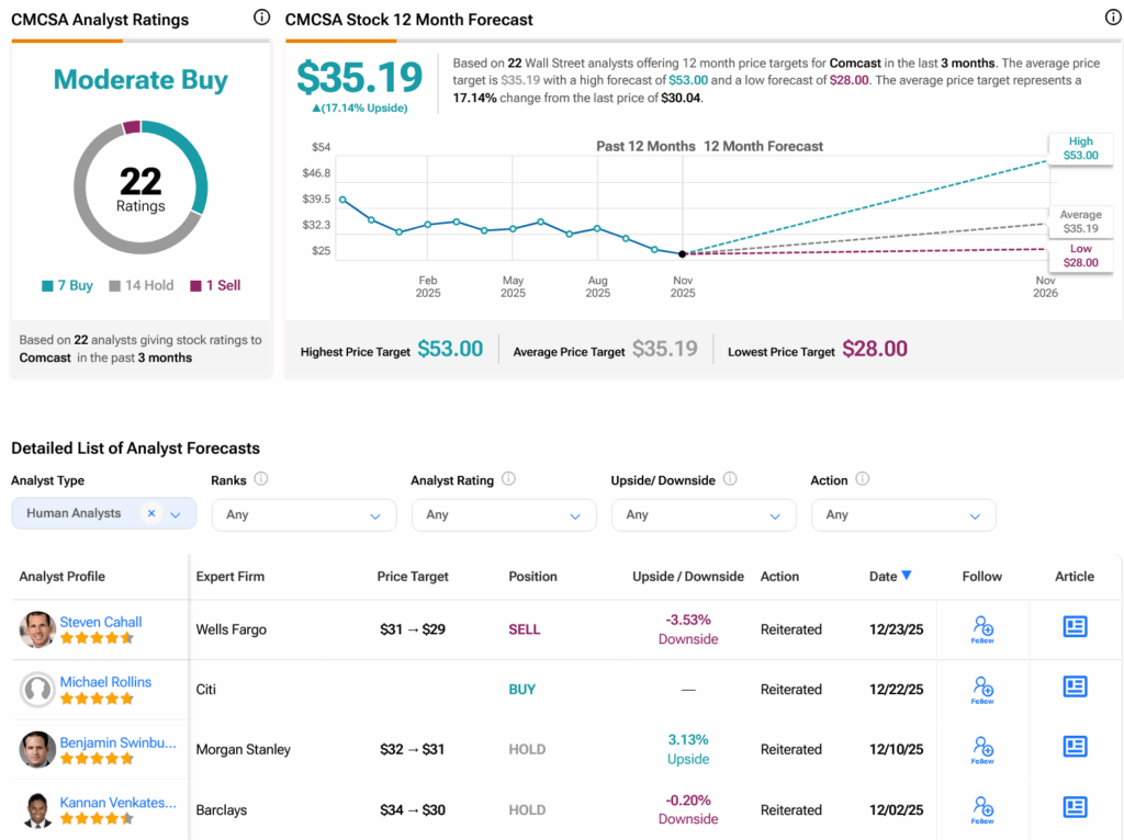 월가 애널리스트들은 최근 3개월간 매수 7건, 보유 14건, 매도 1건의 의견을 제시하며 CMCSA 주식에 대해 보통 매수 컨센서스 등급을 부여했다. 지난 1년간 주가가 20.41% 하락한 후, 평균 CMCSA 목표주가는 주당 35.19달러로 17.14%의 상승 여력을 시사한다.