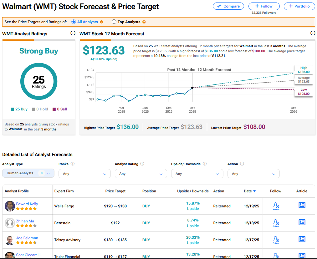 팁랭크스에서 WMT는 25개의 매수 등급을 기반으로 강력 매수 컨센서스를 받고 있다. 최고 목표주가는 136달러다. WMT 주식의 컨센서스 목표주가는 123.63달러로, 10.18%의 상승 여력을 시사한다.