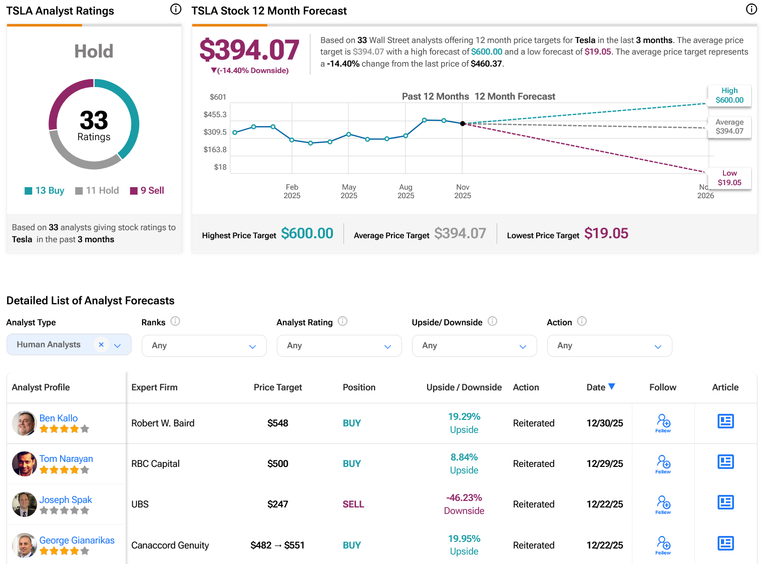 월가에서 애널리스트들은 지난 3개월간 매수 13건, 보유 11건, 매도 9건의 의견을 제시하며 TSLA 주식에 대해 보유 컨센서스 등급을 부여했다. 지난 1년간 주가가 13.82% 상승한 후, 평균 TSLA 목표주가는 주당 394.07달러로 14.4%의 하락 여력을 시사한다.