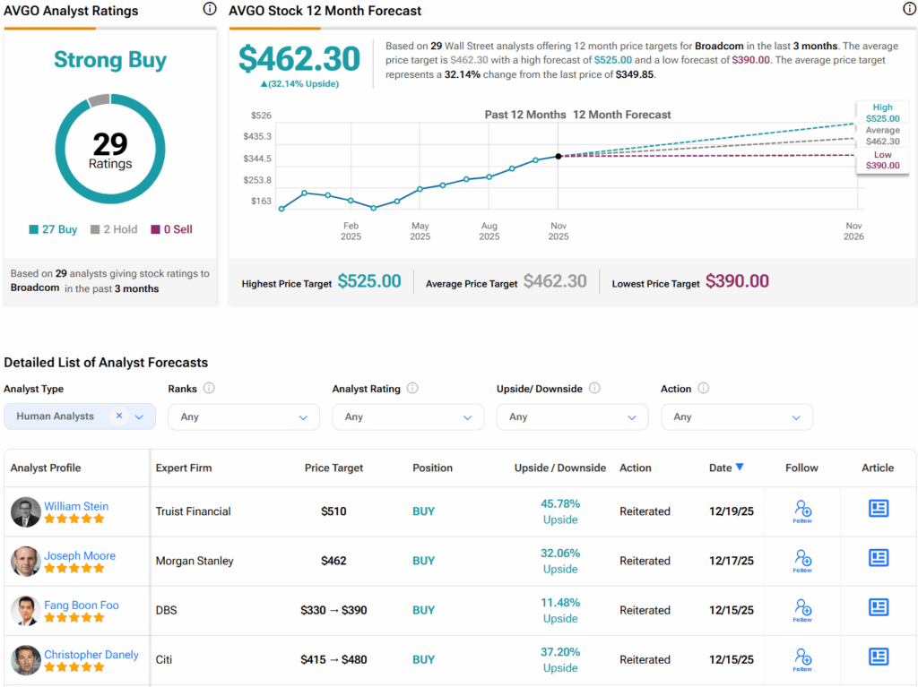 월가로 눈을 돌리면, 애널리스트들은 AVGO 주식에 대해 지난 3개월간 27건의 매수, 2건의 보유, 0건의 매도 의견을 제시하며 아래 그래프에 표시된 것처럼 강력 매수 컨센서스 등급을 부여했다. 또한 AVGO 평균 목표주가는 주당 462.30달러로 32.1%의 상승 여력을 시사한다.