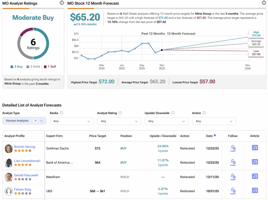 월가로 눈을 돌리면, MO는 지난 3개월간 부여된 3건의 매수, 2건의 보유, 1건의 매도 의견을 바탕으로 보통 매수 컨센서스 등급을 받고 있다. MO 주식의 평균 목표주가 65.20달러는 약 13%의 상승 여력을 시사한다.
