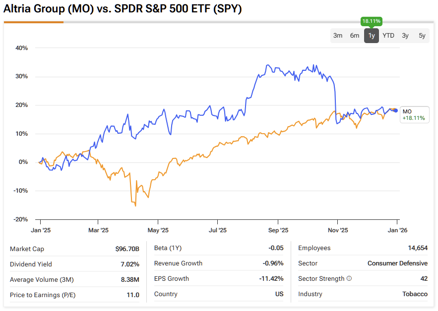 가치와 수익을 모두 제공하는 합리적인 주식을 찾고 있다면 알트리아 그룹(MO)이 눈에 띈다. 특히 S&P 500(SPX)이 사상 최고치로 급등하면서 광범위한 시장의 배당수익률이 1.1%로 떨어진 한 해를 보낸 후에는 더욱 그렇다. 2025년 대부분 기간 동안 S&P를 앞서던 이 주식은 최근 지수와의 동조화 패턴으로 회귀했다.