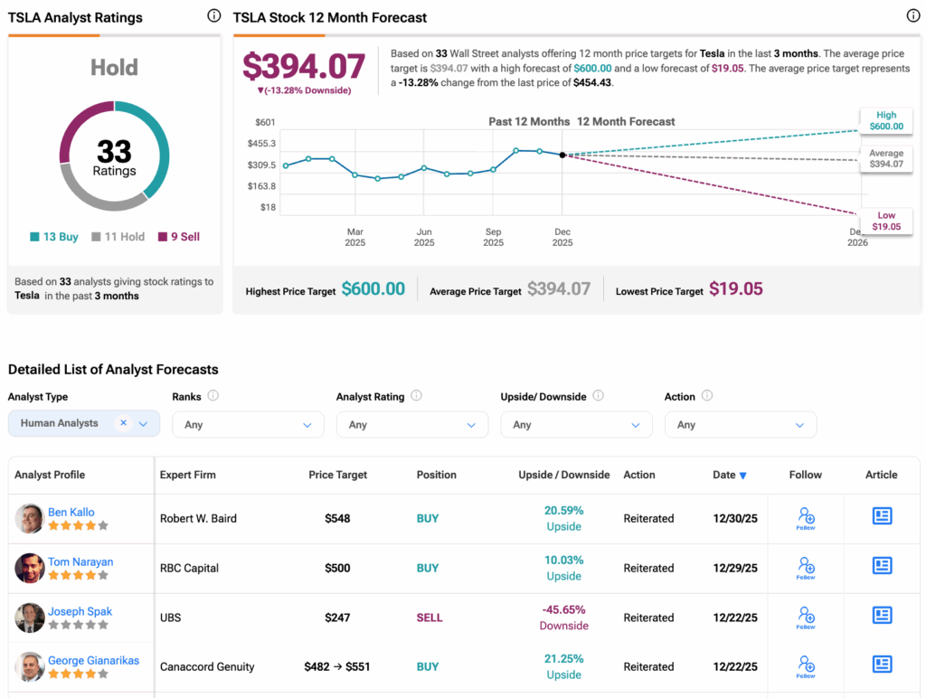 팁랭크스에 따르면 TSLA 주식은 보유 의견 컨센서스 등급을 받았으며, 최근 3개월간 매수 13건, 보유 11건, 매도 9건이 부여됐다. 평균 테슬라 주가 목표가는 394.07달러로, 현재 수준에서 13.28%의 하락 여력을 시사한다.