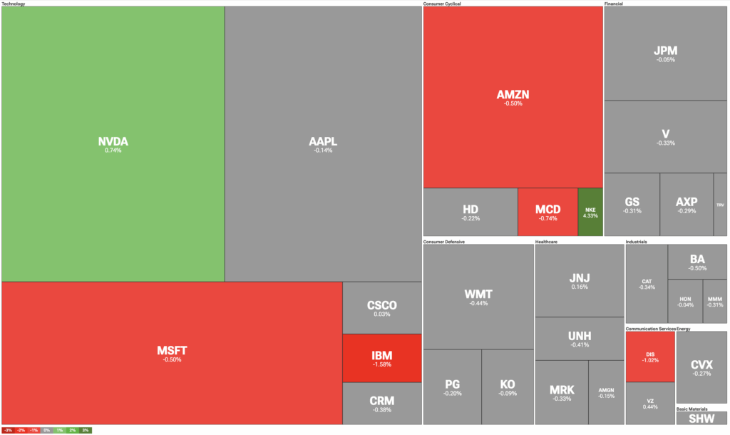 팁랭크스의 다우존스 히트맵으로 전환해 지수의 가격 움직임에 기여한 종목들을 살펴보자.