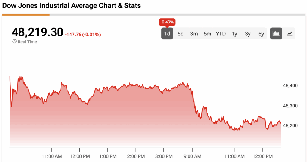 다우존스지수(DJIA)가 올해 마지막 거래일에 긍정적인 실업수당 청구 데이터에도 불구하고 하락세를 보이고 있다.