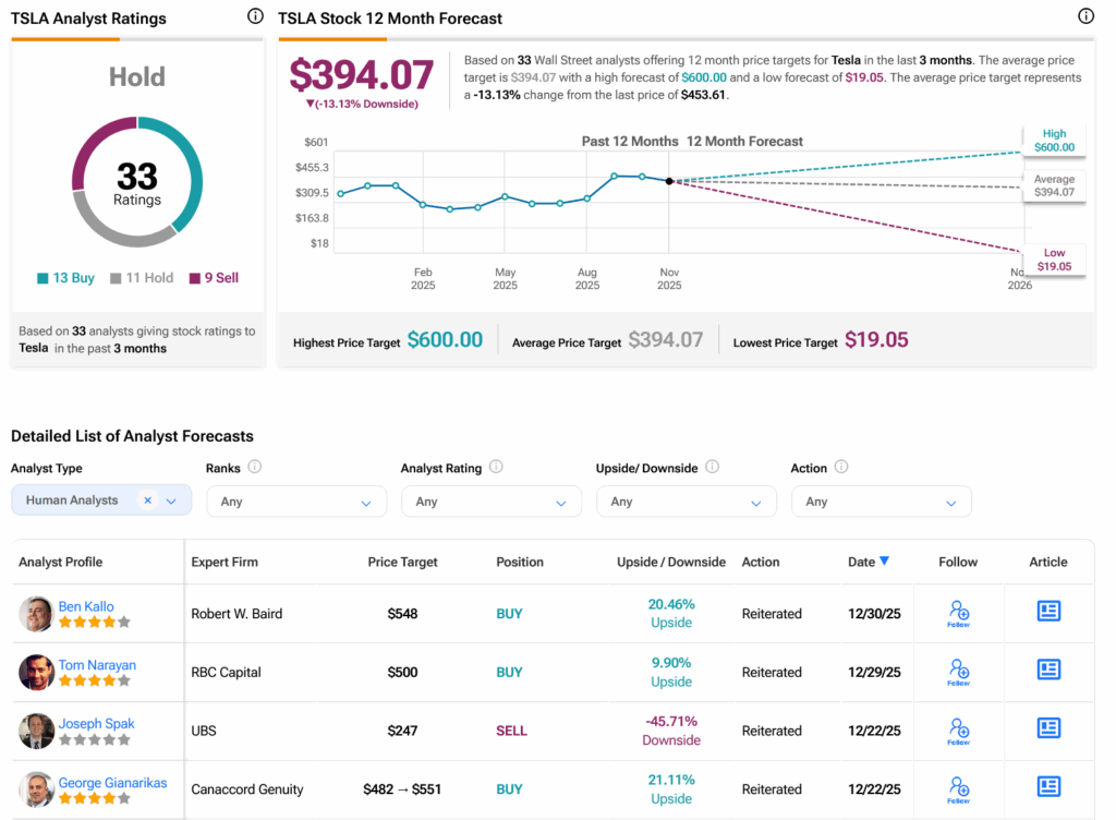 월가에서 애널리스트들은 TSLA 주식에 대해 보유 의견을 제시하고 있다. 아래 그래프에서 볼 수 있듯이 지난 3개월간 매수 13건, 보유 11건, 매도 9건의 의견이 나왔다. 지난 1년간 주가가 19.81% 상승한 후, 주당 평균 TSLA 목표주가 394.07달러는 13.13%의 하락 여력을 시사한다.