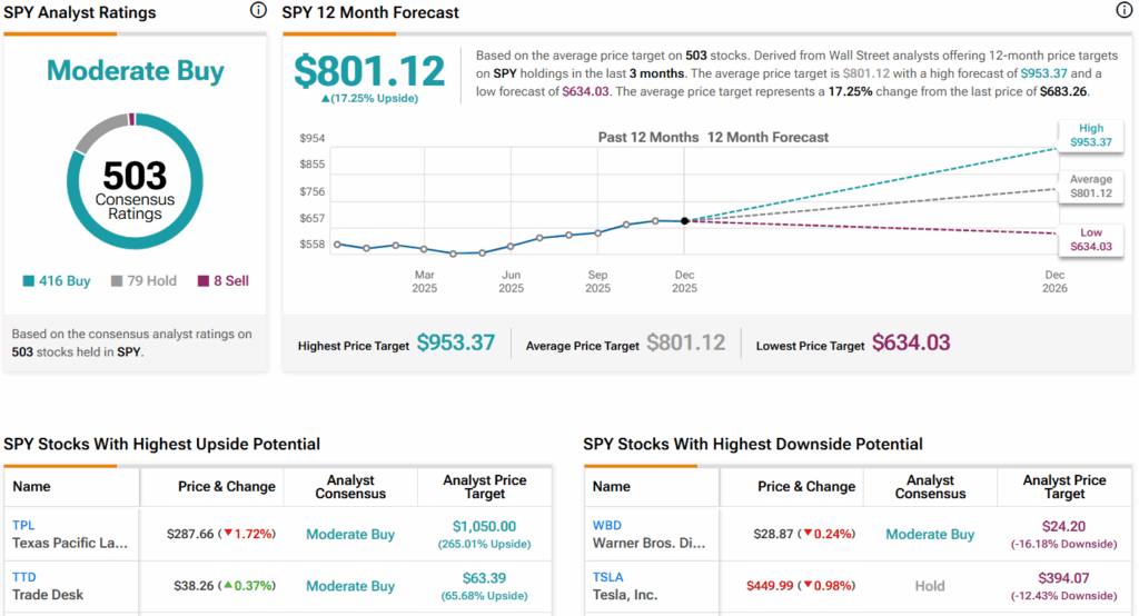 증권가로 눈을 돌리면, 애널리스트들은 SPDR S&P 500 ETF 트러스트 (SPY)에 대해 지난 3개월간 416건의 매수, 79건의 보유, 8건의 매도 의견을 바탕으로 아래 그래픽에 표시된 것처럼 보통 매수 컨센서스 등급을 부여했다. 또한 주당 평균 SPY 목표주가 801.12달러는 17.3%의 상승 여력을 시사한다.